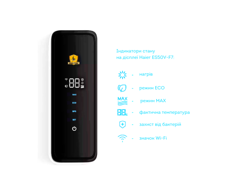 | Оснащення та функції | Wi-Fi + електронне інтелектуальне керування - повний контроль водонагрівачів Haier з будь-якої точки світу. За допомогою додатоку «hOn» можна керувати функціоналом зі свого смартфону. Нагрівальний елемент (ТЕН) виготовлений із високоякісної нержавіючої сталі (сплав Incoloy 800) та має дуже високий тепловий ККД. ShockРroof – захист від ураження струмом. Функція BPS - термічна дезінфекція від бактерій, шляхом переведення на короткочасне нагрівання води до t 80⁰C. Fast Saving - прискорене нагрівання води завдяки системі 2-х ТЕНів ( 2 х 1,5кВт). 7 років гарантії на внутрішній бак. Захист від тепловтрати завдяки теплоізоляції 30мм. |